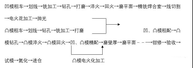 車加工→劃線→銑加工→鉆孔→打磨→淬火→回火→磨平面→精銑導(dǎo)流槽→線切割→電火花加工→拋光→鉗修→驗收→試?!M(jìn)倉